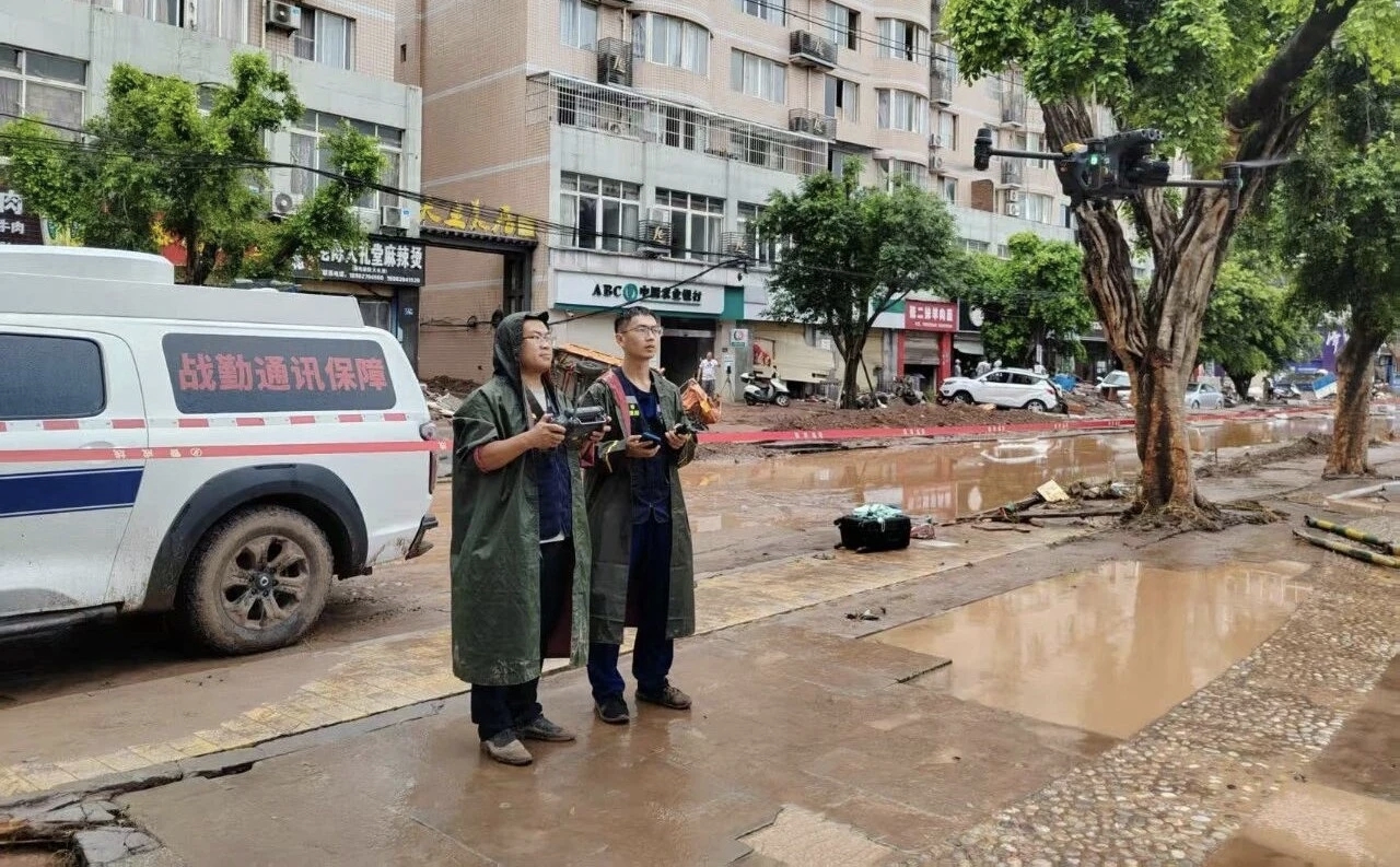 很快,卫星便携站开通,无人机腾空而起,从高空俯瞰县城——洪水走势、路况信息尽收眼底。雨势渐小,队员们往城里走。受灾最重的街道上,被冲走的车辆如叠罗汉般挤在一起。他们手持记录仪、单兵设备边走边拍,在低洼区架起布控球紧盯水位。